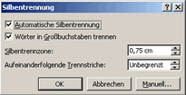 Diese findet man in der Menüleiste [Extras] [Spachen] [Silbentrennung]. Aktiviert man die Option “Automatische Silbentrennung” werden im gesamten Dokument die Worte getrennt, bei denen der Abstand zwischen dem letzen Wort und dem rechten Seitenrand größer ist als der Wert, der unter “Silbentrennzone” eingetragen ist.